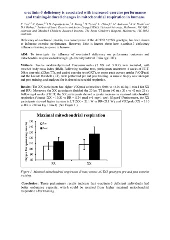 Publication is Abstract only. Deficiency of α-actinin-3 protein, as a consequence of the ACTN3 577XX genotype, has been shown to influence exercise performance. However, little is known about how α-actinin-3 deficiency influences training response in humans.