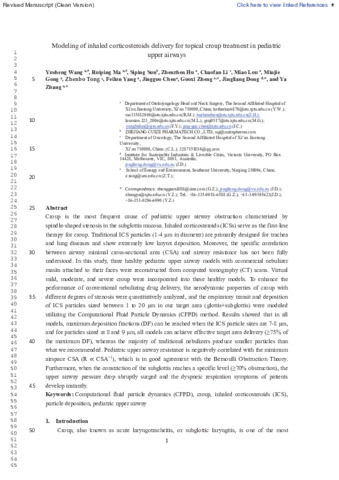 Wang, Yusheng ORCID logoORCID: https://orcid.org/0009-0000-5139-4634, Ma, Ruiping, Sun, Siping, Hu, Zhenzhen, Li, Chaofan, Lou, Miao, Gong, Minjie, Tong, Zhenbo ORCID logoORCID: https://orcid.org/0000-0001-5290-443X, Yang, Feilun, Chen, Jingguo, Zheng, Guoxi, Dong, Jingliang ORCID logoORCID: https://orcid.org/0000-0002-2812-6188 and Zhang, Ya (2023) Modeling of inhaled corticosteroids delivery for topical croup treatment in pediatric upper airways. Journal of Drug Delivery Science and Technology, 85. ISSN 1773-2247 (In Press)