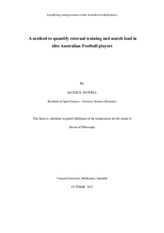 Dowell, Jackie E (2023) Quantifying running volume in elite Australian Football players: a method to quantify external training and match load in elite Australian Football players. PhD thesis, Victoria University.