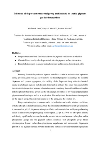 Influence of dispersant functional group architecture on titania pigment particle interactions.