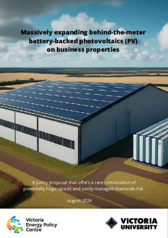 Mountain, B. (2024). Massively expanding behind-the-meter battery-backed photovoltaics (PV) on business properties. Victoria Energy Policy Centre, Victoria University. https://doi.org/10.26196/4FJP-6D40