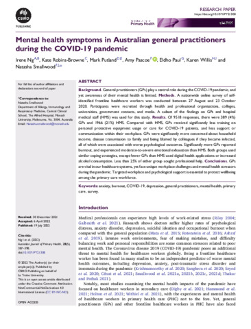 Ng, Irene ORCID logoORCID: https://orcid.org/0000-0002-6632-5604, Robins-Browne, Kate, Putland, Mark ORCID logoORCID: https://orcid.org/0000-0002-1994-252X, Pascoe, Amy ORCID logoORCID: https://orcid.org/0000-0002-3555-6856, Paul, Eldho, Willis, Karen ORCID logoORCID: https://orcid.org/0000-0001-8036-8814 and Smallwood, Natasha ORCID logoORCID: https://orcid.org/0000-0002-3403-3586 (2022) Mental health symptoms in Australian general practitioners during the COVID-19 pandemic. Australian Journal of Primary Health, 28 (5). pp. 387-398. ISSN 1448-7527