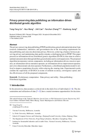 Ge, Yong-Feng ORCID logoORCID: https://orcid.org/0000-0002-5955-6295, Wang, Hua ORCID logoORCID: https://orcid.org/0000-0002-8465-0996, Cao, Jinli, Zhang, Yanchun and Jiang, Xiaohong (2024) Privacy-preserving data publishing: an information-driven distributed genetic algorithm. World Wide Web, 27 (1). ISSN 1386-145X