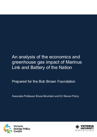 Mountain, B., & Steven, P. (2020). An analysis of the economics and greenhouse gas impact of Marinus Link and Battery of the Nation. Victoria Energy Policy Centre, Victoria University. https://doi.org/10.26196/WT44-0Y52