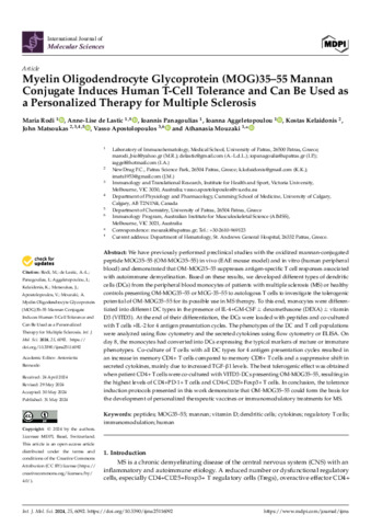 Rodi, Maria ORCID logoORCID: https://orcid.org/0000-0001-6578-0851, de Lastic, Anne-Lise ORCID logoORCID: https://orcid.org/0000-0002-3152-4777, Panagoulias, Ioannis, Aggeletopoulou, Ioanna ORCID logoORCID: https://orcid.org/0000-0003-4489-1485, Kelaidonis, Kostas, Matsoukas, John ORCID logoORCID: https://orcid.org/0000-0001-5554-2964, Apostolopoulos, Vasso ORCID logoORCID: https://orcid.org/0000-0001-6788-2771 and Mouzaki, Athanasia ORCID logoORCID: https://orcid.org/0000-0001-5548-7002 (2024) Myelin Oligodendrocyte Glycoprotein (MOG)35–55 Mannan Conjugate Induces Human T-Cell Tolerance and Can Be Used as a Personalized Therapy for Multiple Sclerosis. International Journal of Molecular Sciences, 25 (11). ISSN 1661-6596 (print) 1422-0067 (online)