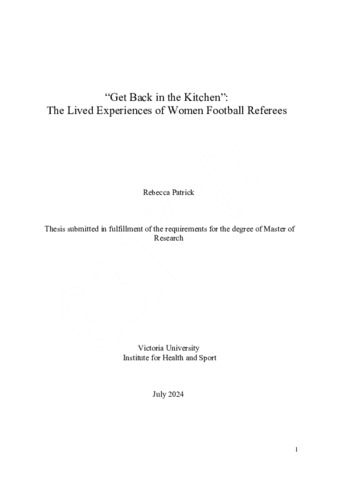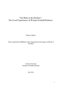 Patrick, Rebecca (2024) “Get Back in the Kitchen”: The Lived Experiences of Women Football Referees. Research Master thesis, Victoria University.