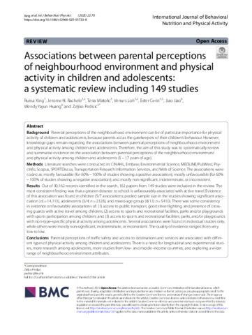 Xing, Ruirui ORCID logoORCID: https://orcid.org/0000-0002-0058-1488, Rachele, Jerome ORCID logoORCID: https://orcid.org/0000-0002-5101-4010, Matolić, Tena ORCID logoORCID: https://orcid.org/0000-0003-4218-0735, Loh, Venurs ORCID logoORCID: https://orcid.org/0000-0003-1821-1087, Cerin, Ester ORCID logoORCID: https://orcid.org/0000-0002-7599-165X, Jiao, Jiao, Huang, Wendy Yajun and Pedisic, Zeljko ORCID logoORCID: https://orcid.org/0000-0003-2886-3556 (2025) Associations between parental perceptions of neighbourhood environment and physical activity in children and adolescents: a systematic review including 149 studies. International Journal of Behavioral Nutrition and Physical Activity, 22 (1). ISSN 1479-5868 (In Press)