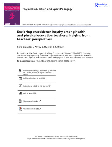 Luguetti, Carla ORCID logoORCID: https://orcid.org/0000-0002-9442-1636, Alfrey, Laura ORCID logoORCID: https://orcid.org/0000-0002-4200-710X, Hudson, Christopher ORCID logoORCID: https://orcid.org/0000-0002-4059-9316 and Brown, Claire ORCID logoORCID: https://orcid.org/0000-0002-6894-2657 (2025) Exploring practitioner inquiry among health and physical education teachers: insights from teachers’ perspectives. Physical Education and Sport Pedagogy. ISSN 1740-8989