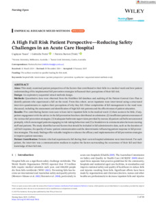 Yasan, Caglayan ORCID logoORCID: https://orcid.org/0000-0002-5002-7637, Pretto, Gabriella ORCID logoORCID: https://orcid.org/0000-0002-5481-1429 and Burton, Patricia ORCID logoORCID: https://orcid.org/0000-0001-6893-7148 (2025) A High Fall Risk Patient Perspective—Reducing Safety Challenges in an Acute Care Hospital. Nursing Open, 12 (2). ISSN 2054-1058
