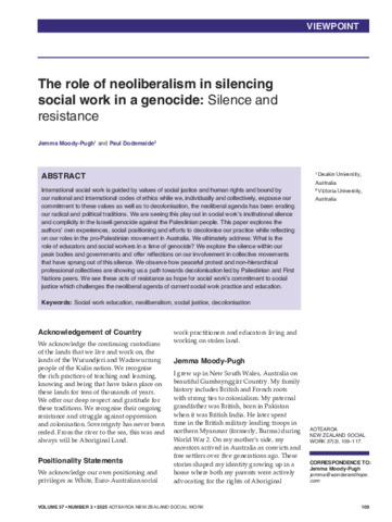 The role of neoliberalism in silencing social work in a genocide: Silence and resistance.