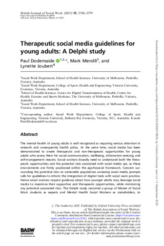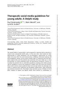 Dodemaide, Paul ORCID logoORCID: https://orcid.org/0000-0001-8418-5935, Merolli, Mark and Joubert, Lynette (2025) Therapeutic social media guidelines for young adults: A Delphi study. British Journal of Social Work, 55 (5). pp. 2356-2379. ISSN 0045-3102