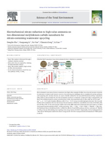 Zhu, Donglin, Li, Guoguang, Yan, Xu, Geng, Chunxia and Gao, Li ORCID logoORCID: https://orcid.org/0000-0001-5827-5814 (2023) Electrochemical nitrate reduction to high-value ammonia on two-dimensional molybdenum carbide nanosheets for nitrate-containing wastewater upcycling. Science of the Total Environment, 878. ISSN 0048-9697