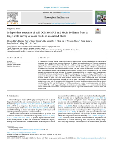 Liu, Siwan, Fan, Linhua, Chang, Chao, Ge, Zhengkui, Ma, Ning, Chen, Wenbin, Yang, Fang, Pan, Baozhu, Li, Ming and Gao, Li ORCID logoORCID: https://orcid.org/0000-0001-5827-5814 (2022) Independent response of soil DOM to MAT and MAP: Evidence from a large-scale survey of moss crusts in mainland China. Ecological Indicators, 142. ISSN 1470-160X