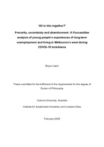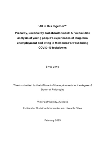 Lewis, Bryce (2025) ‘All in this together?’ Precarity, uncertainty and abandonment: A Foucauldian analysis of young people’s experiences of long-term unemployment and living in Melbourne’s west during COVID-19 lockdowns. PhD thesis, Victoria University.