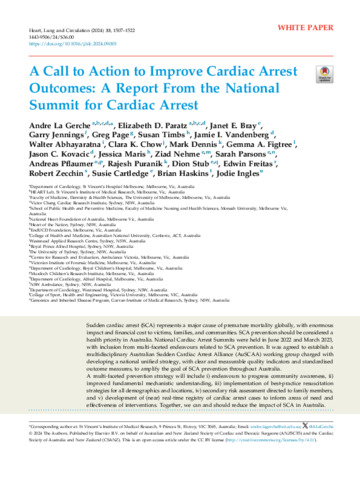 La Gerche, A, Paratz, ED, Bray, JE, Jennings, G, Page, G, Timbs, S, Vandenberg, JI, Abhayaratna, W, Chow, CK, Dennis, M, Figtree, GA, Kovacic, JC, Maris, J, Nehme, Z, Parsons, S, Pflaumer, A, Puranik, R, Stub, D, Freitas, E, Zecchin, R, Cartledge, S, Haskins, Brian ORCID logoORCID: https://orcid.org/0000-0002-8445-4477 and Ingles, J (2024) A Call to Action to Improve Cardiac Arrest Outcomes: A Report From the National Summit for Cardiac Arrest. Heart Lung and Circulation, 33 (11). pp. 1507-1522. ISSN 1443-9506