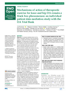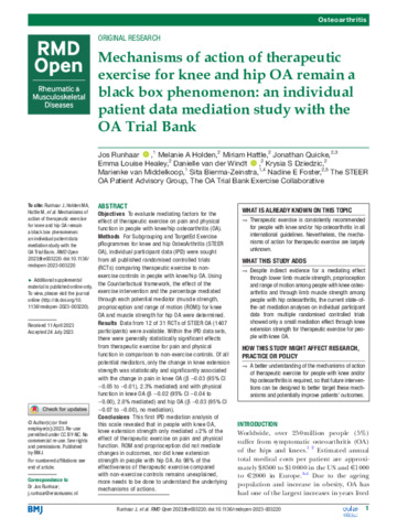 Runhaar, Jos ORCID logoORCID: https://orcid.org/0000-0002-6293-6707, Holden, Melanie A, Hattle, Miriam, Quicke, Jonathan, Healey, Emma Louise, van der Windt, Danielle ORCID logoORCID: https://orcid.org/0000-0002-7248-6703, Dziedzic, Krysia S, van Middelkoop, Marienke, Bierma-Zeinstra, Sita, Foster, Nadine E, Brown, Jenny, Ingram, Carol, Hickson, Sheila, Taylor, Robert, Walker, Christine, Haxby Abbott, J, Allen, Kelli, Hurley, Michael, Bennell, Kim L, Bossen, David, Chaipinyo, Kanda, Cochrane, Tom, de Rooij, Mariëtte, Risberg, May Arna, Fitzgerald, Kelley, French, Helen, Hale, Leigh, Henriksen, Marius, Hinman, Rana S, Hopman-Rock, Marijke, Keogh, Justin, Veenhof, Justin, Knoop, Jesper, Krauß, Inga, Levinger, Pazit, McCarthy, Christopher, Messier, Stephen P, Heinonen, Ari, Osteras, Havard, Anwer, Shahnawaz, Lacerda, Ana Cristina Rodrigues, Shankar, Ganesh, Steinhilber, Benjamin, Suzuki, Yusuke, Hunt, Michael A, Talbot, Laura, Teirlinck, Carolien, Doherty, Michael, Tsai, Pao-Feng, Wallis, Jason and Menek, Merve Yilmaz (2023) Mechanisms of action of therapeutic exercise for knee and hip OA remain a black box phenomenon: An individual patient data mediation study with the OA Trial Bank. Rmd Open, 9 (3). ISSN 2056-5933