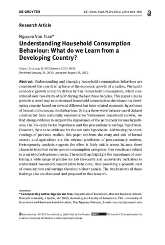 Nguyen, Van Tran ORCID logoORCID: https://orcid.org/0000-0001-6289-9531 (2022) Understanding Household Consumption Behaviour: What do we Learn from a Developing Country? B.E. Journal of Economic Analysis & Policy, 22 (4). pp. 801-858. ISSN 2194-6108