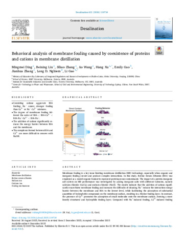 Ding, Mingmei, Liu, Beining, Zhang, Sihao, Wang, Ao, Xu, Hang, Gao, Emily, Zhang, Jianhua ORCID logoORCID: https://orcid.org/0000-0002-8674-0485, Nghiem, Long D and Gao, Li ORCID logoORCID: https://orcid.org/0000-0001-5827-5814 (2026) Behavioral analysis of membrane fouling caused by coexistence of proteins and cations in membrane distillation. Desalination, 621. ISSN 0011-9164