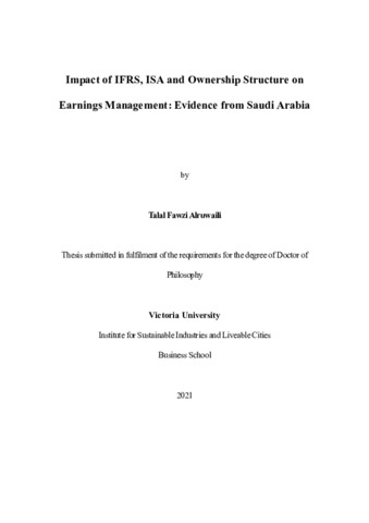 Alruwaili, Talal Fawzi (2021) Impact of IFRS, ISA and Ownership Structure on Earnings Management: Evidence from Saudi Arabia. PhD thesis, Victoria University.