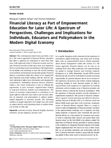 Akbaş, Müzeyyen Çiğdem and Seedsman, Terence (2024) Financial Literacy as Part of Empowerment Education for Later Life: A Spectrum of Perspectives, Challenges and Implications for Individuals, Educators and Policymakers in the Modern Digital Economy. Economics, 18 (1). ISSN 1864-6042