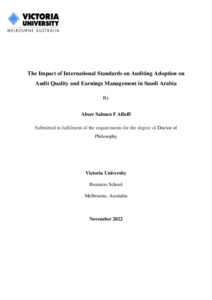 Alfaifi, Abeer Salman F (2022) The Impact of International Standards on Auditing Adoption on Audit Quality and Earnings Management in Saudi Arabia. PhD thesis, Victoria University.